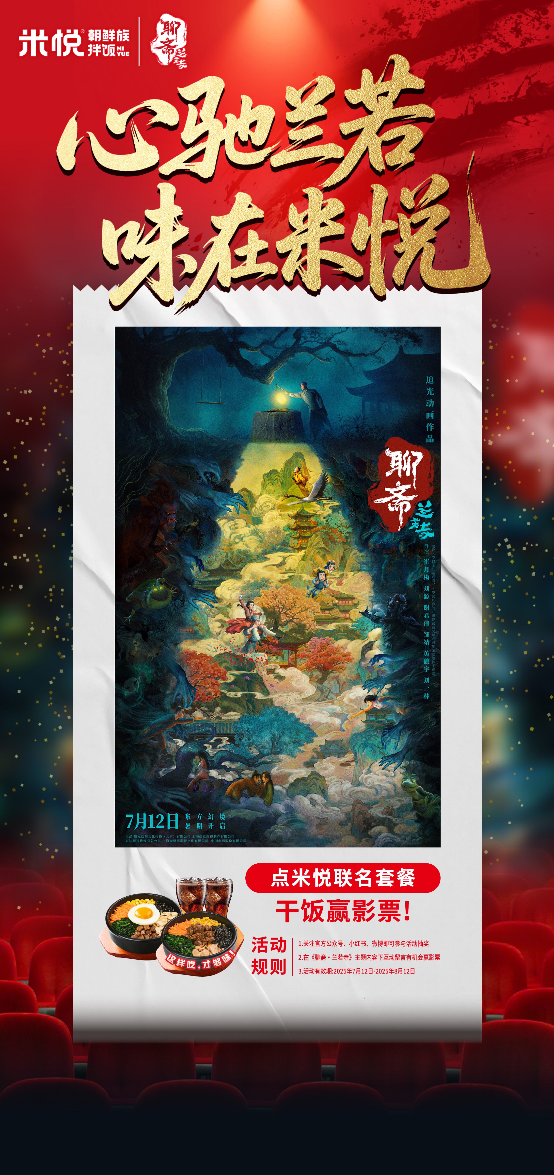 在活动期间(2025年7月12日 - 2025年8月12日),米悦朝鲜族拌饭将围绕电影《聊斋:兰若寺》推出系列线上线下福利玩法,邀请消费者一同开启一场“餐桌上的奇幻之旅”。